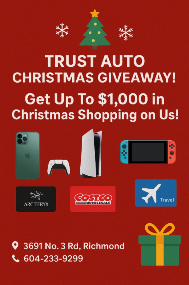 Pick up your car this December at Trust Auto and enter our Christmas Giveaway—win prizes worth up to $1,000!